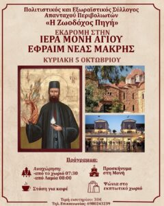 Μία ακόμα πολύ πετυχημένη εκδρομή οργάνωσε ο Σύλλογος Απανταχού Περιβολιωτών “ΖΩΟΔΟΧΟΣ ΠΗΓΗ” την Κυρικακή 5 Οκτωβρίου 2025. Τελικός προορισμός η Νέα Μάκρη Αττικής για προσκύνημα του σκηνώματος του νεοφανούς εκ Τρικάλων καταγομένου Αγίου Εφραίμ στην ομώνυμη Ιερά Μονή. Εκεί οι εκδρομείς προσκύνησαν το ιερό λείψανο του, το οποίο φυλάσσεται και τιμάται στη μονή από το 1950, όταν τότε μία μοναχή είδε σε όραμα τον Άγιο, ο οποίος της υπέδειξε το σημείο όπου ήταν θαμμένο το σώμα του.