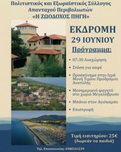Άλλη μια εκδρομή οργάνωσε ο Σύλλογος Απανταχού Περιβολιωτών “ΖΩΟΔΟΧΟΣ ΠΗΓΗ” την Κυριακή 29 Ιουνίου 2025. Περίπου 30 εκδρομείς ξεκίνησαν το πρωί από το Περιβόλι για τα παράλια της Λάρισας. Κύριος σκοπός προσκύνημα στην Ιερά Μονή Τιμίου Προδρόμου Ανατολής Λάρισας. Πολύ ενδιαφέρουσα ήταν η ξενάγηση της μοναχής. Στο χωριό Μεγαλόβρυσο έγινε στάση για το μεσημεριανό φαγητό. Το προβλεπόμενο μπάνιο στον Αγιόκαμπο ακυρώθηκε λόγω του καιρού. Έτσι οι εκδρομείς αρκέστηκαν σε μια βόλτα στο όμορφο παραθαλάσσιο αυτό χωριό. Με πολύ καλές εντυπώσεις επέστρεψαν αργά το βράδυ στην έδρα τους.